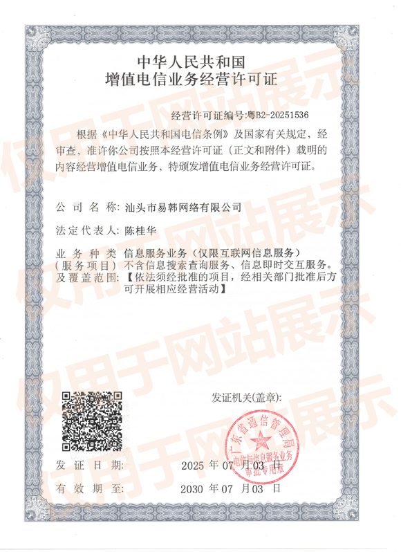 汕頭市易韓網(wǎng)絡(luò)有限公司icp增值電信業(yè)務(wù)經(jīng)營許可證:粵b2-20251536