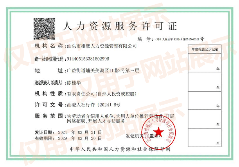 汕頭市雄鷹人力資源管理有限公司人力資源服務(wù)許可證